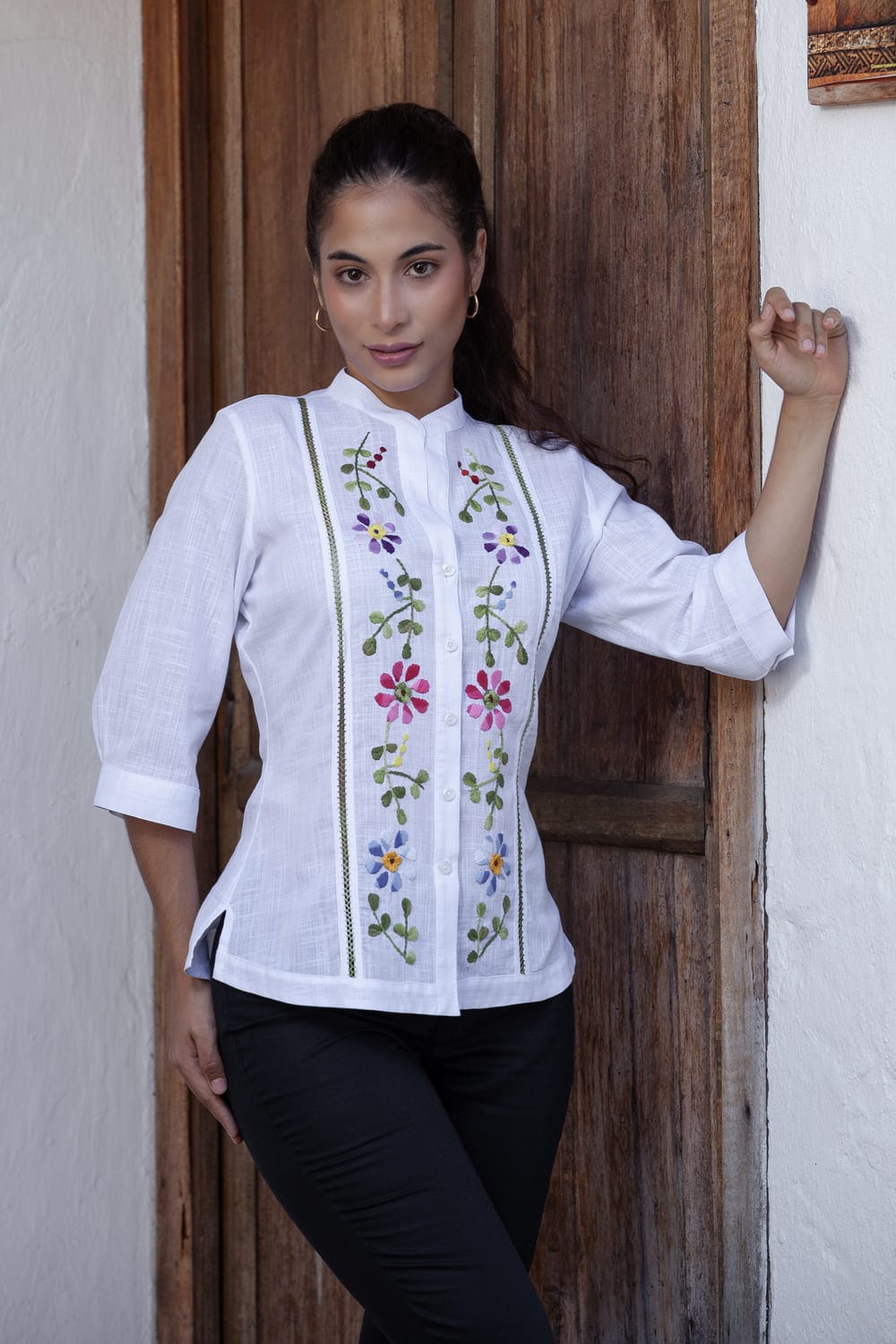 Confeccionada en tela Yolanda color blanco, ofrece una textura suave, ligera y transpirable, ideal para climas cálidos o templados. Su diseño de cuello Neru y manga 3/4 aporta un estilo moderno y refinado, mientras que el bordado floral artesanal en puntos patecabra y pasado recorre el frente con un patrón lleno de color, detalle y armonía, elaborado a mano por expertas artesanas.