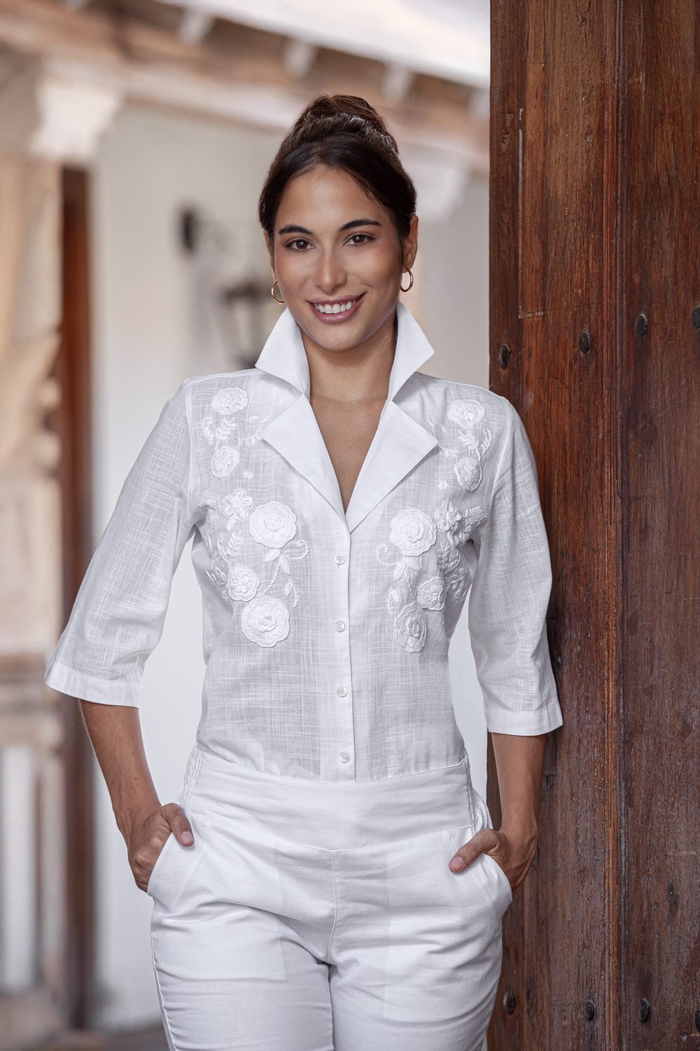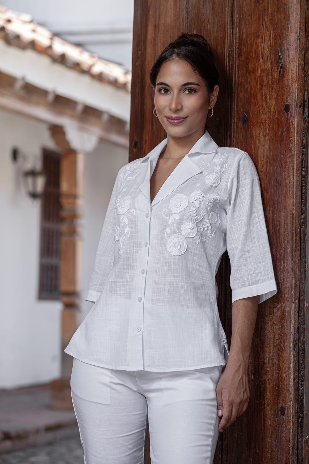 Confeccionada en tela Yolanda de color blanco, esta prenda se distingue por su ligereza, suavidad y transpirabilidad, lo que la convierte en una opción ideal para climas cálidos o templados. Su diseño de cuello smoking y manga 3/4 estiliza la figura, mientras que los bordados en puntos peineta y pasado dibujan delicadas flores que realzan el frente con un toque de sofisticación única.