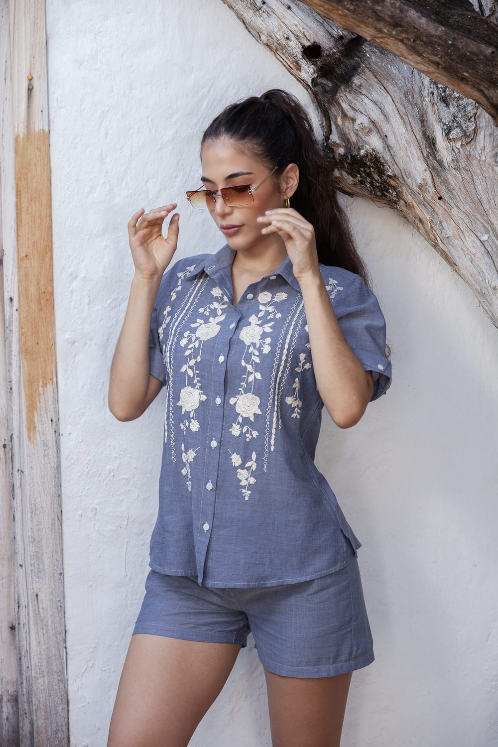 Blusa manga corta en chambray con delicado bordado artesanal. Una prenda fresca, versátil y elegante, perfecta para un estilo natural y auténtico.