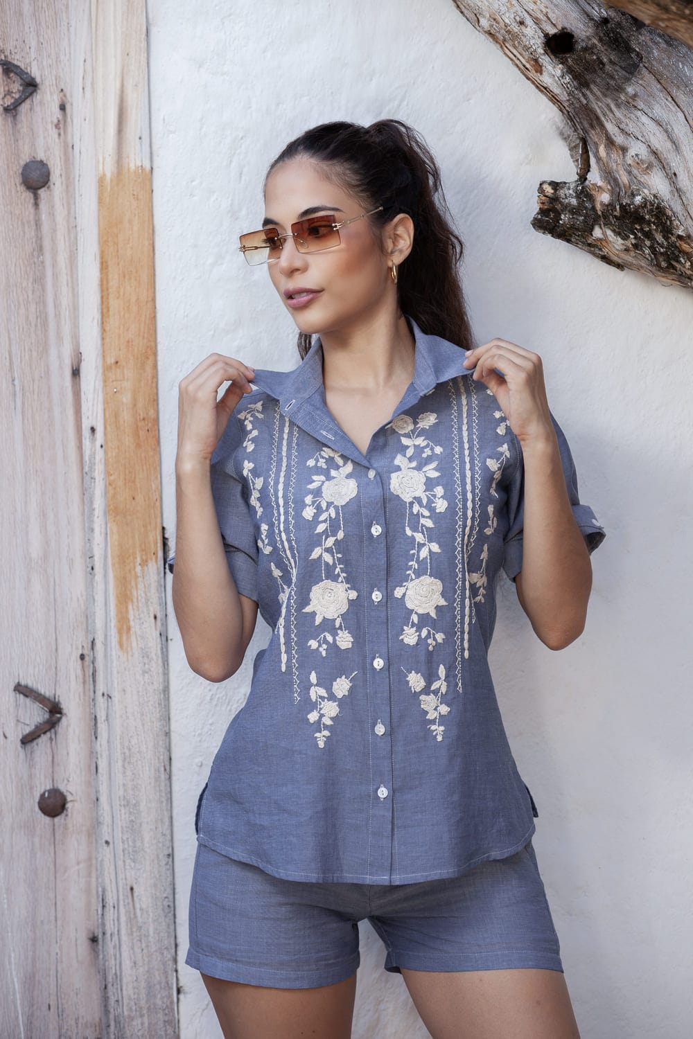 Confeccionada en chambray índigo claro, esta prenda destaca por su textura ligera y suave, perfecta para climas cálidos o templados. El bordado artesanal, realizado con las técnicas de peineta, cordón y pespunte, adorna el frente con delicados motivos que resaltan sobre el azul claro de la tela. Su corte camisero de manga corta ofrece comodidad y un estilo versátil que se adapta tanto a combinaciones casuales como a conjuntos más elegantes.