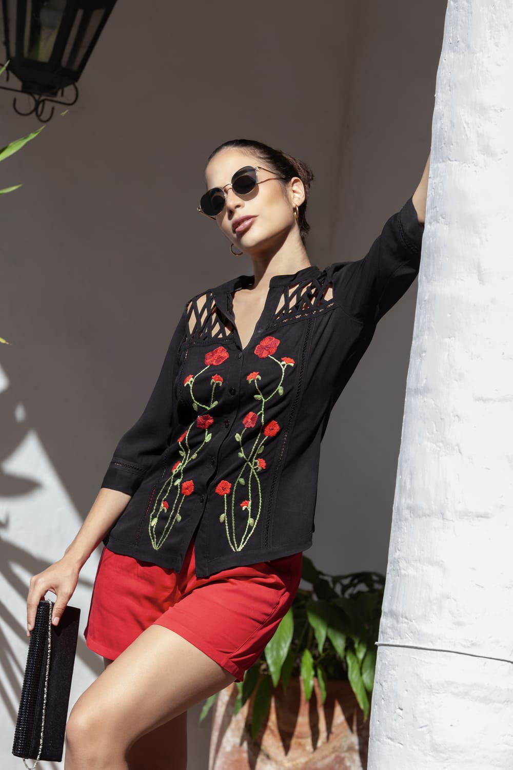 Blusa cuello Neru negra con bordado a mano en flores rojas