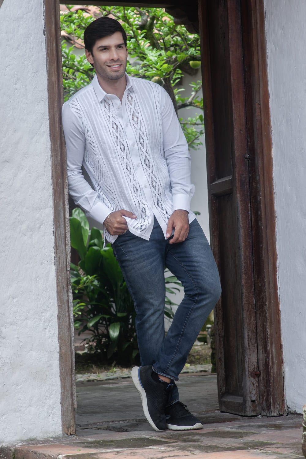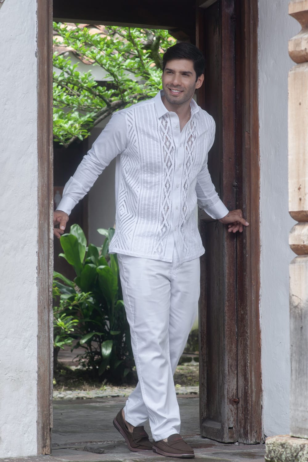 Guayabera Blanca con Diseño Cruzado en Calado